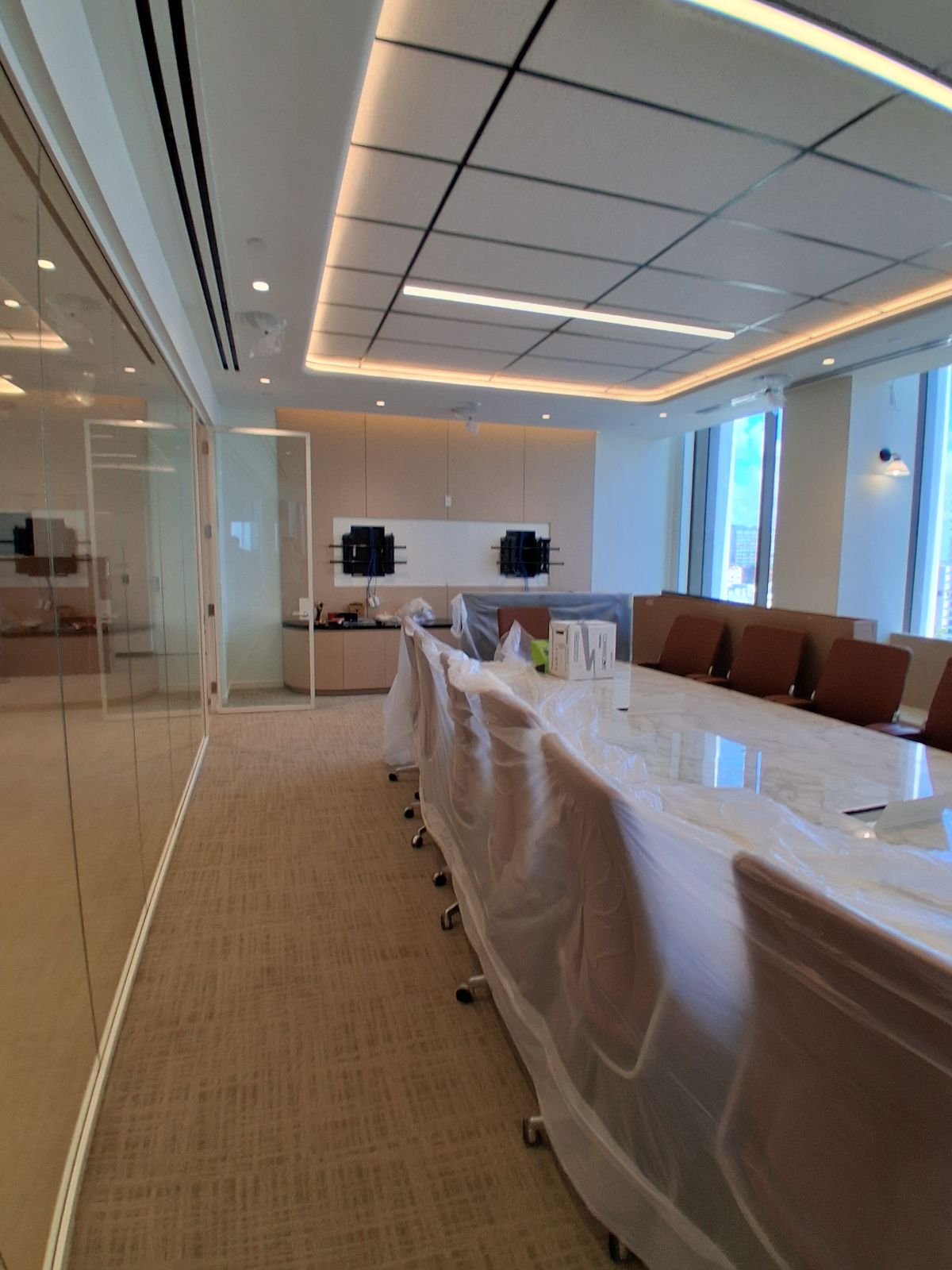 Empty conference room with a large table covered in plastic, surrounded by chairs, and large windows letting in natural light.