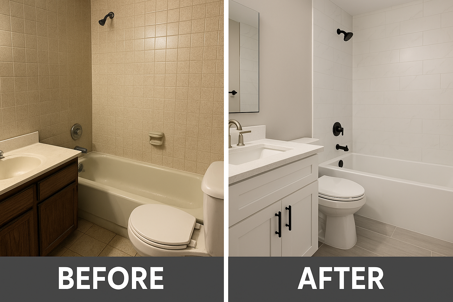 Comparison of a bathroom before and after renovation, featuring a bathtub, toilet, and vanity in the old bathroom, and a modern white bathroom with a bathtub, toilet, vanity, and a mirror in the renovated version.