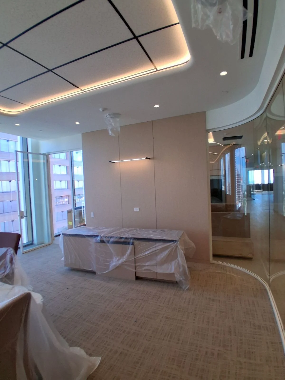 Modern, unfinished interior space with large windows, beige walls, a beige carpet, and a tailored ceiling with lighting, covered furniture, and glass walls.